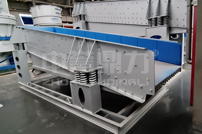 振動喂料機又稱振動給料機,可把塊狀、顆粒狀物料從貯料倉中均勻、連續地給到受料裝置中去,在砂石生產線中可為破碎機械連續均勻地喂料,并對物料進行粗篩分,廣泛用于冶金、煤礦、選礦、建材、化工、磨料等行業的破碎、篩分聯合設備中。